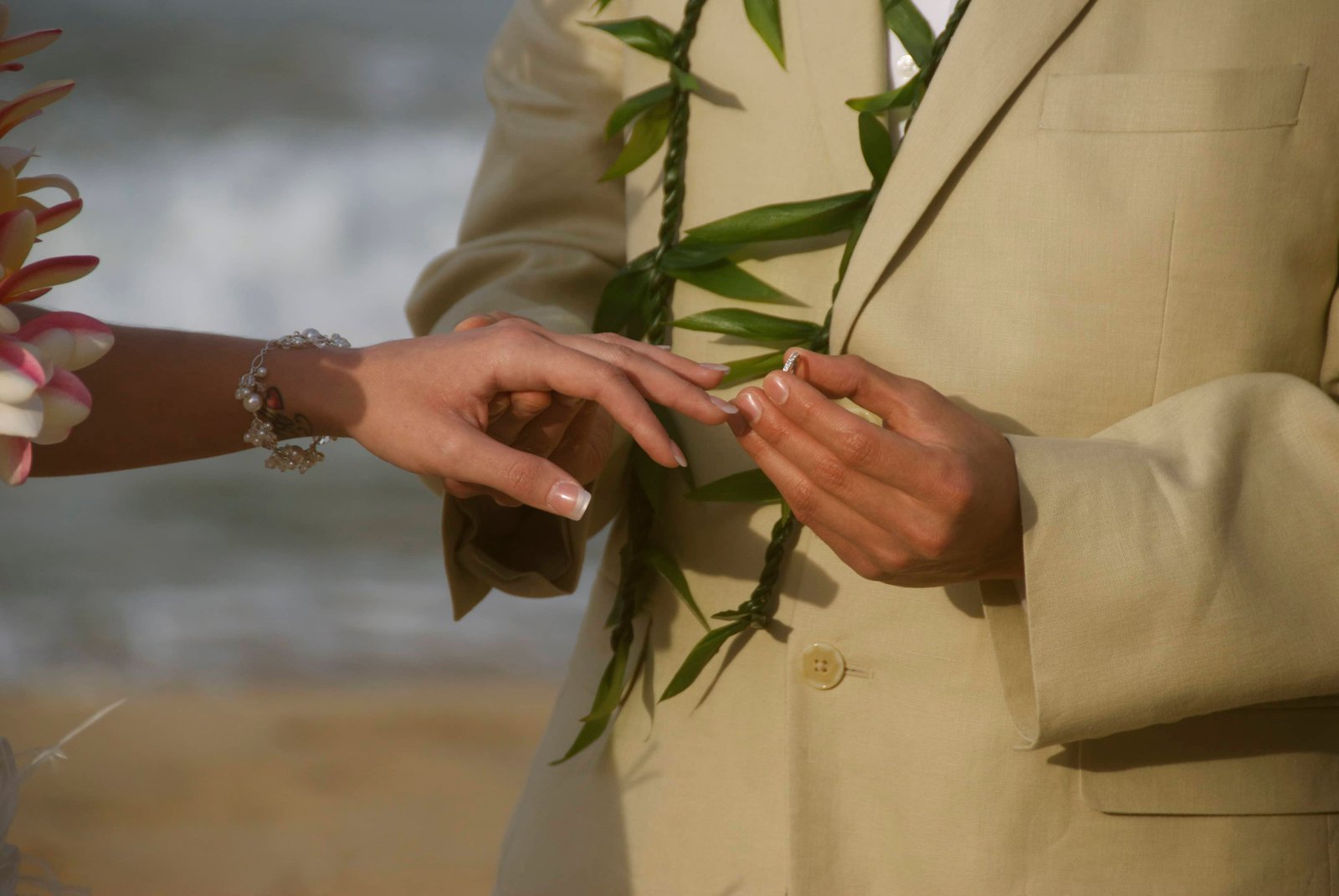 If you put it on from underneath, the photographer can get a much better photo angel, and if you do it slowly she can take more/better ring photos during the beach wedding ceremony.